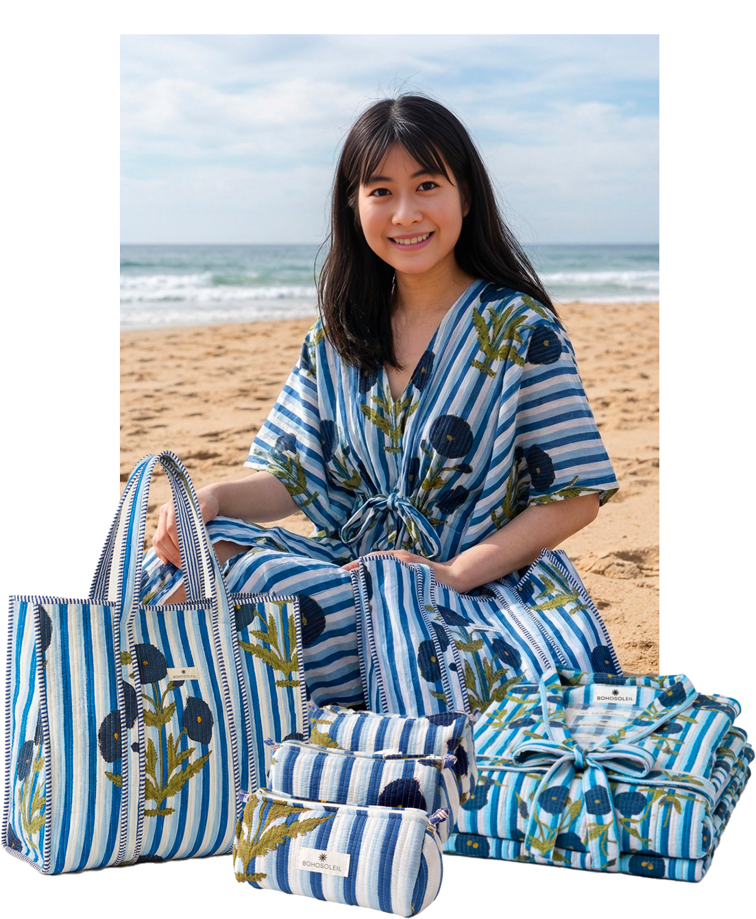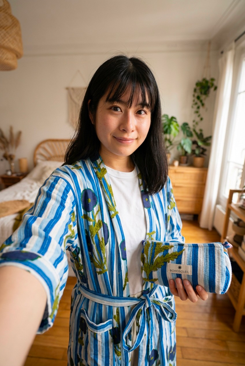 The Signature Set brings together Bohosoleil’s four iconic pieces: a bathrobe, a caftan, a trio of quilted pouches, and a matching tote bag. Each piece is crafted from 100% natural cotton and hand-printed using the traditional block-printing technique, in which patterns are applied one by one using carved wooden blocks. The slight variations in the print are a testament to authentic artisanal craftsmanship, entirely handmade in India. It includes: