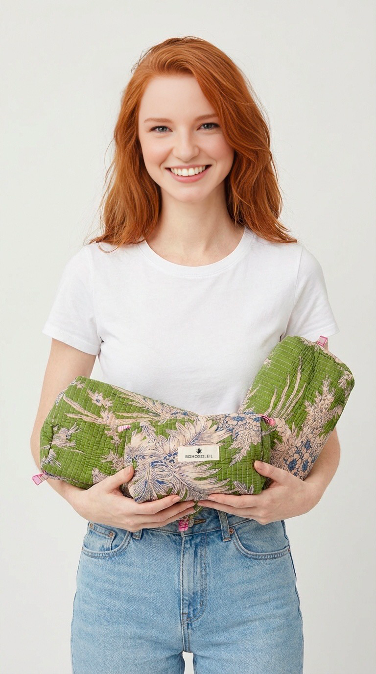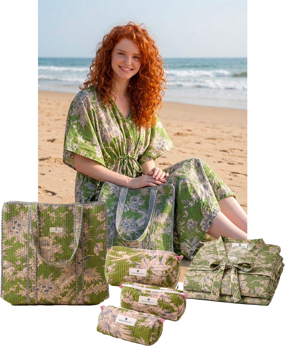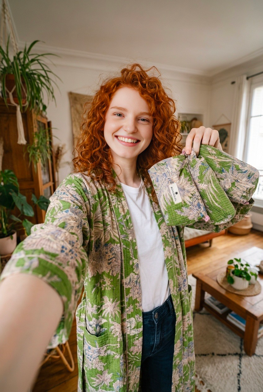 The Signature Set brings together Bohosoleil’s four iconic pieces: a bathrobe, a caftan, a trio of quilted pouches, and a matching tote bag. Each piece is crafted from 100% natural cotton and hand-printed using the traditional block-printing technique, in which patterns are applied one by one using carved wooden blocks. The slight variations in the print are a testament to authentic artisanal craftsmanship, entirely handmade in India. It includes:
