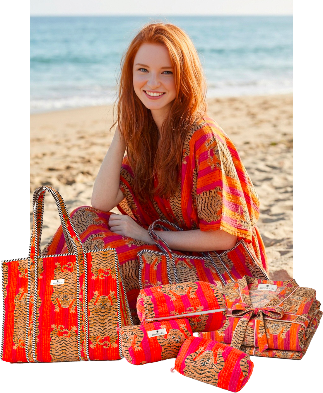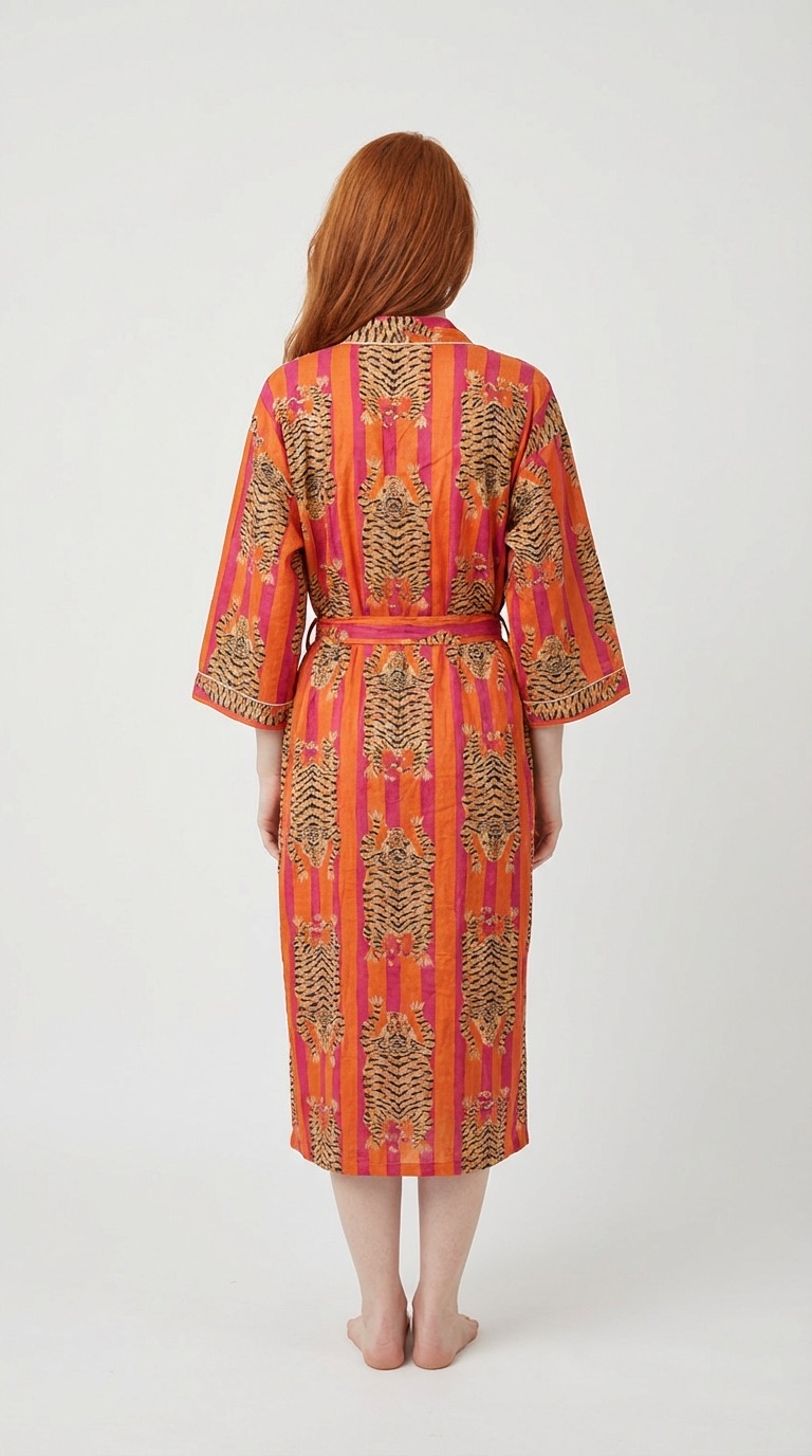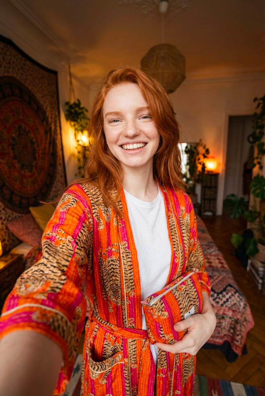The Signature Set brings together Bohosoleil’s four iconic pieces: a bathrobe, a caftan, a trio of quilted pouches, and a matching tote bag. Each piece is crafted from 100% natural cotton and hand-printed using the traditional block-printing technique, in which patterns are applied one by one using carved wooden blocks. The slight variations in the print are a testament to authentic artisanal craftsmanship, entirely handmade in India. It includes: