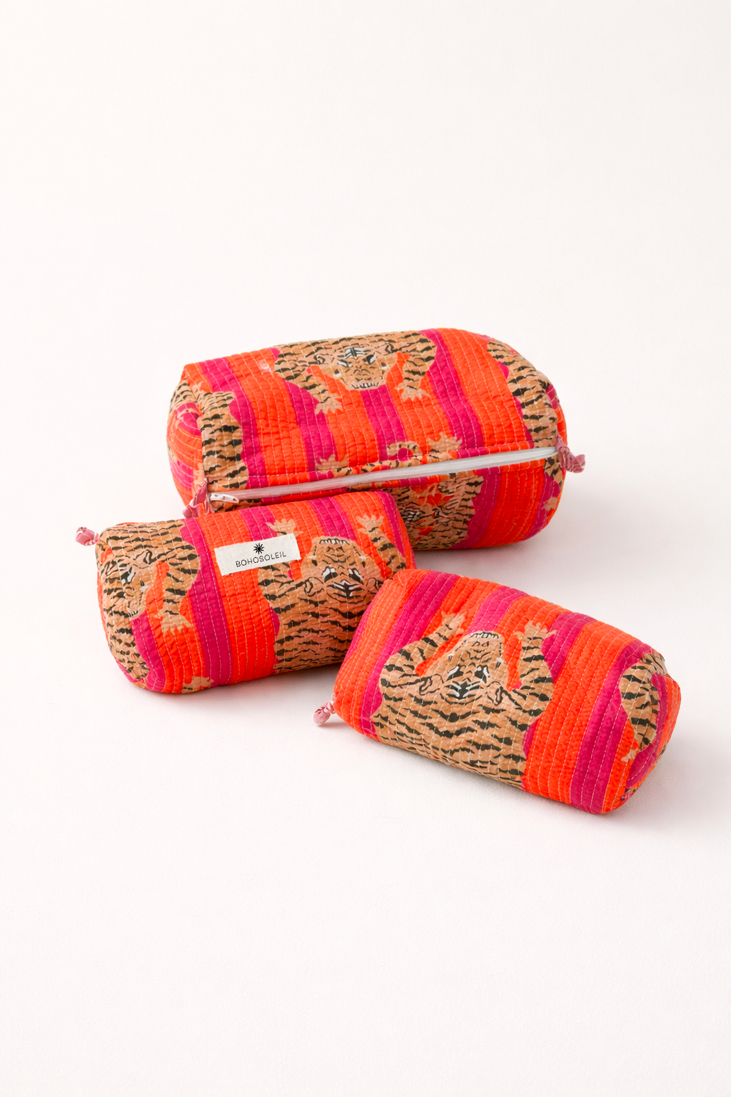 These three quilted cotton pouches make a harmonious set, perfect for the bathroom, travel, or everyday organization.