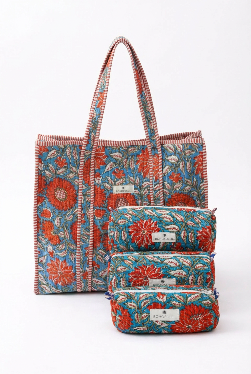Combining the quilted cotton tote and the set of three matching pouches, this kit creates a harmonious, refined, and incredibly practical set. Handmade from Indian block-print fabric, both pieces celebrate an ancestral craft where each motif is applied by hand using carved wooden blocks.