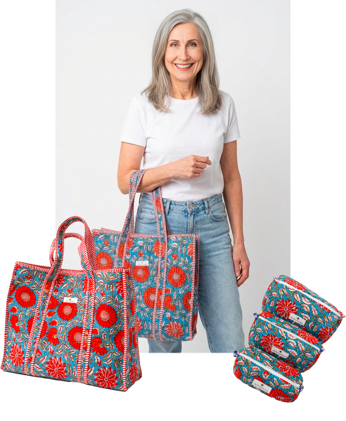 The Block Print Weekend Set also makes for an original gift idea, perfect for giving someone an elegant set that’s useful for everyday use. This tote bag and pouch set is an ideal gift for a trip, a birthday, Mother’s Day, or simply as a stylish and practical treat for yourself or someone else. In short, it’s a duo that combines style, practicality and tradition.