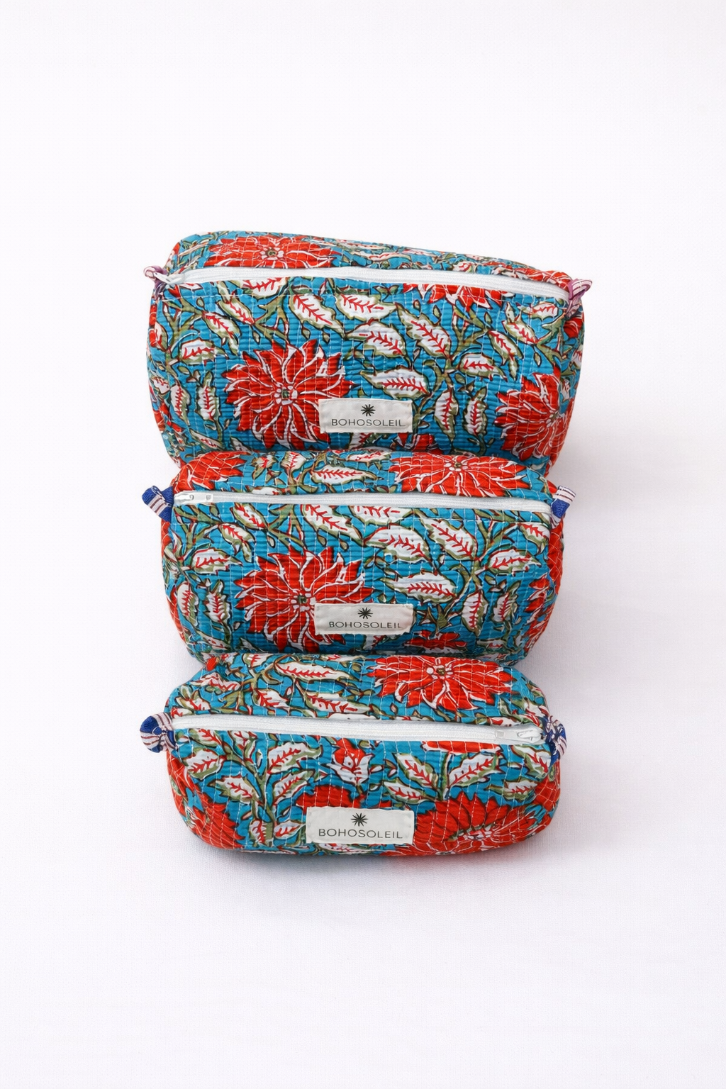Handcrafted from Indian block-printed fabric, the three bags share the same graphic theme, which is harmoniously incorporated into each piece.