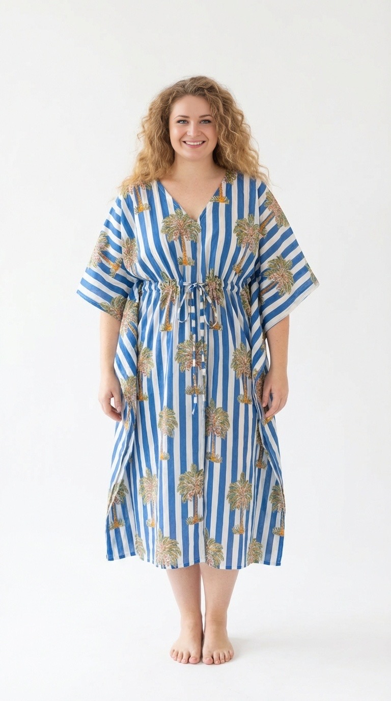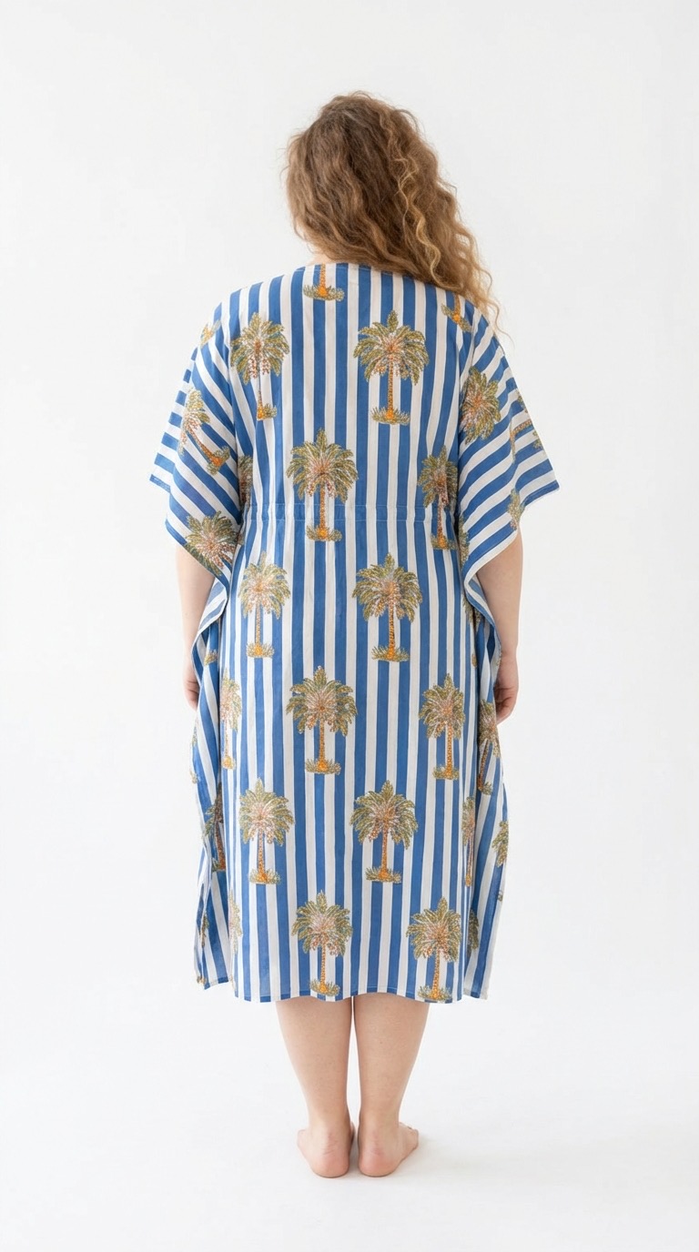 Le caftan Nice en coton block print fait main est confectionné selon une technique textile traditionnelle indienne. Chaque motif est imprimé manuellement à l’aide de tampons en bois sculptés, appliqués un à un sur le coton naturel. Ce procédé artisanal confère au tissu profondeur et caractère. Les légères variations d’impression ne sont pas des imperfections, mais la signature d’un véritable travail fait main.
