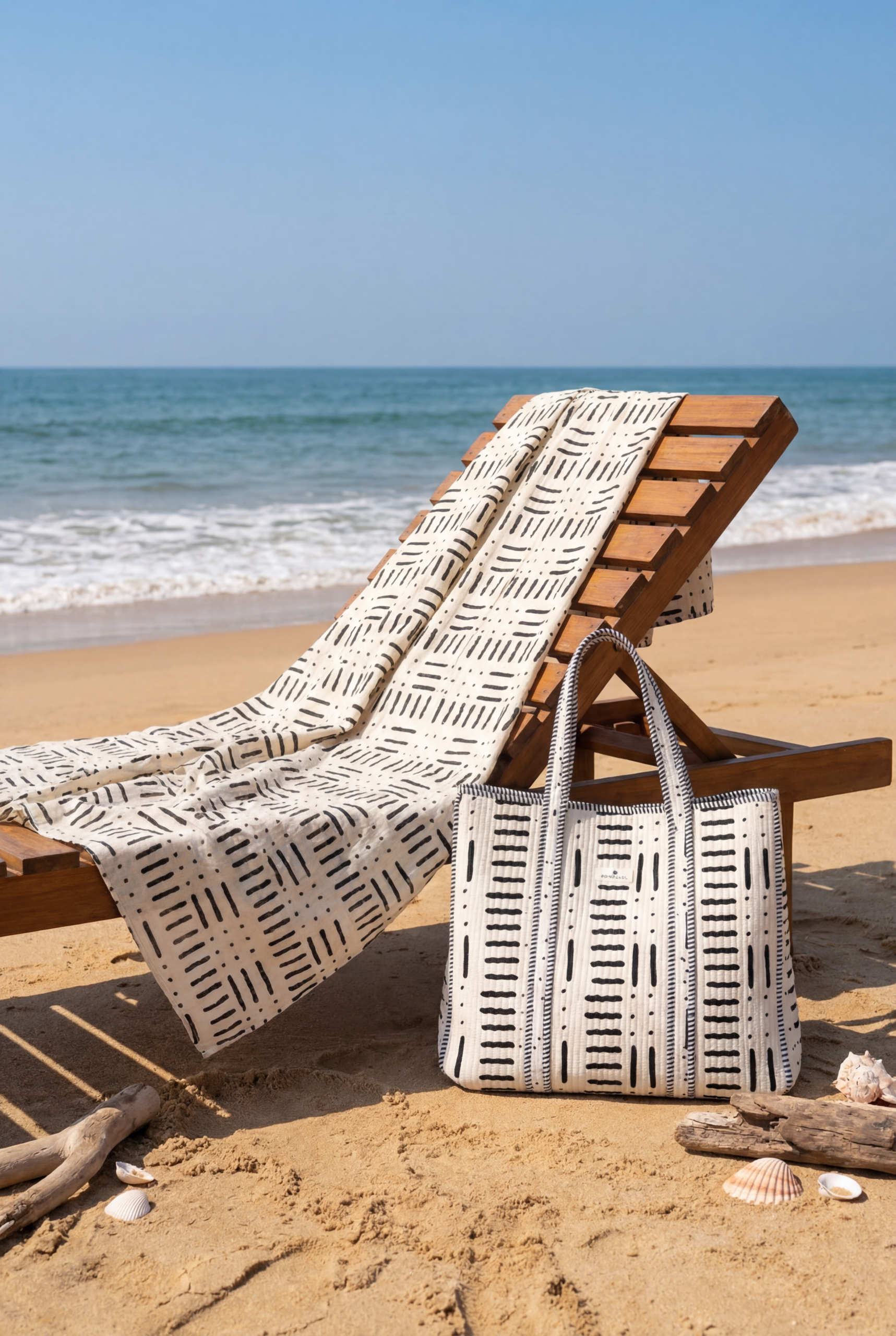 Le cabas assorti, spacieux et élégant, permet d’emporter facilement tous les essentiels de plage.