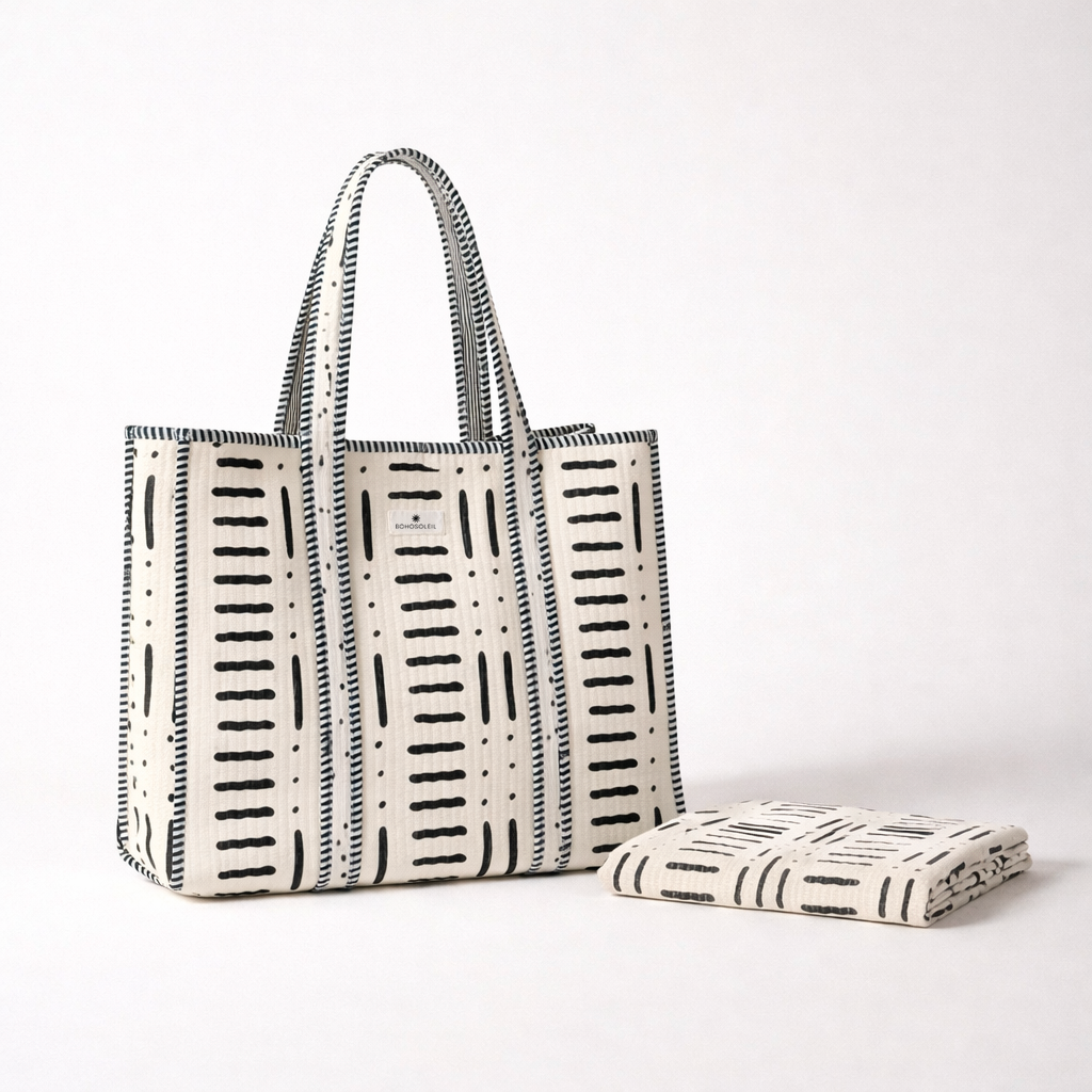 Le kit Plage en coton block print rassemble deux indispensables de l’été : un paréo léger et un sac cabas en coton matelassé, confectionnés à la main dans un tissu block print indien. Les motifs sont imprimés artisanalement à l’aide de tampons en bois sculptés, selon une technique traditionnelle qui confère au textile profondeur et authenticité.
