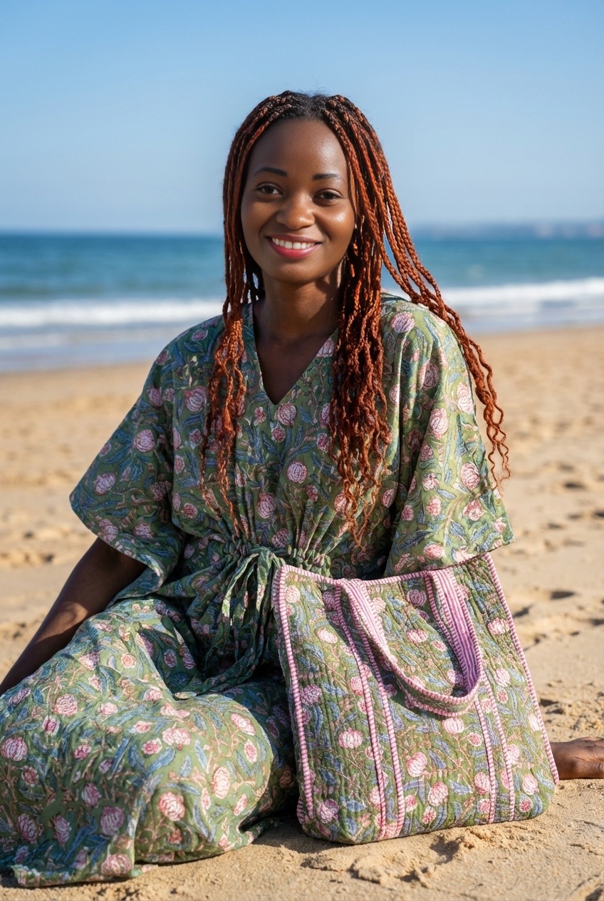 Le kit Voyage de Bohosoleil réunit trois pièces emblématiques du savoir-faire indien : un caftan fluide, un trio de trousses matelassées et un cabas spacieux, tous confectionnés en block print artisanal. Chaque motif est imprimé à la main avec des tampons en bois sculptés, offrant à chaque pièce une identité unique, faite de subtiles variations, signatures du véritable travail fait main.