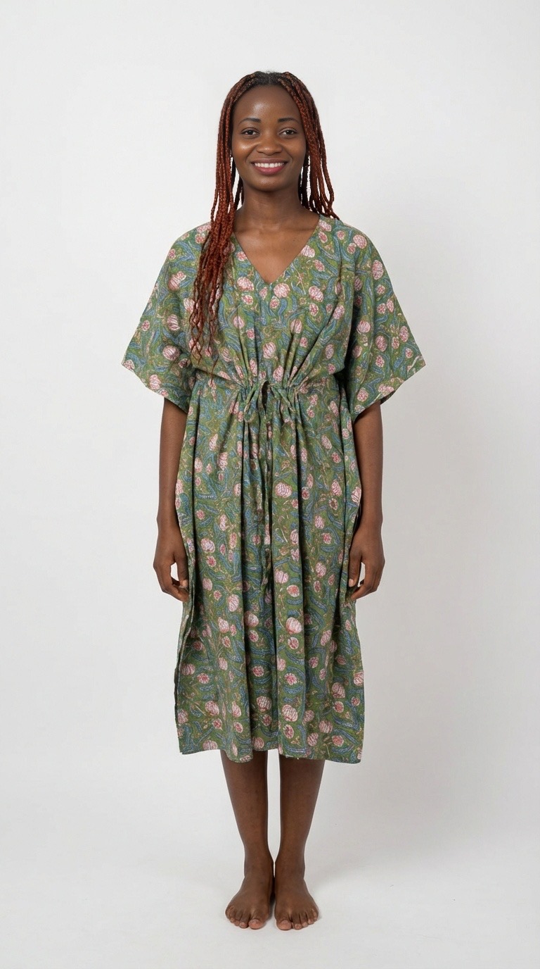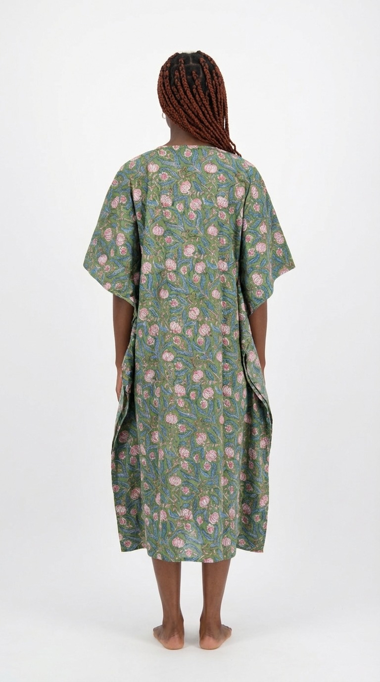 - un caftan en coton block print, fluide et élégant