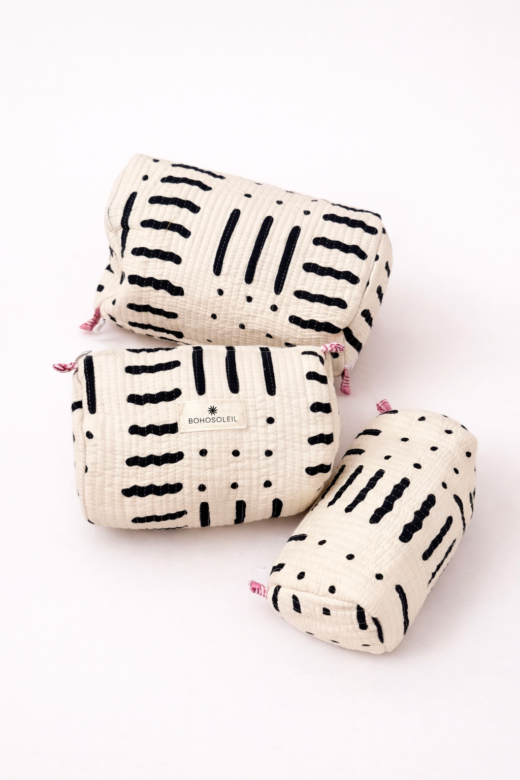 Réalisées en coton matelassé block print et doublées de nylon imperméable, les trois trousses s’organisent naturellement :
