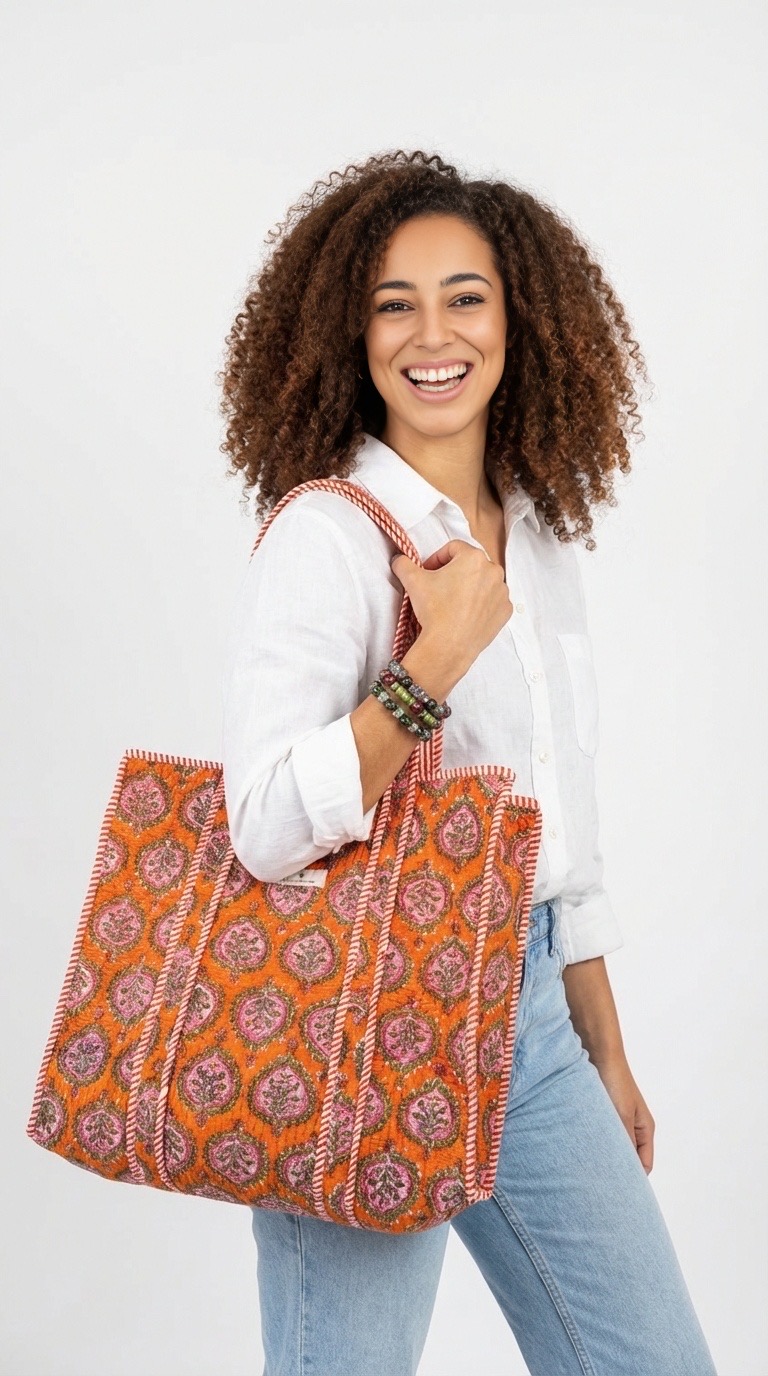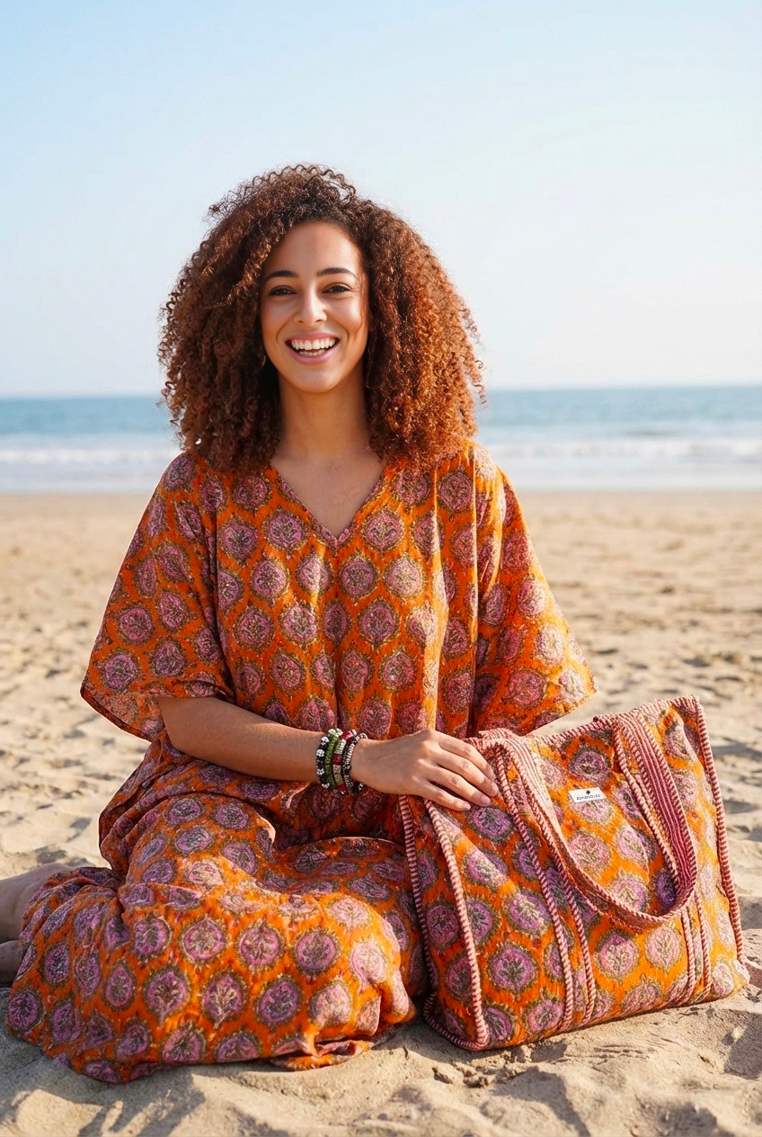 Le kit Voyage de Bohosoleil réunit trois pièces emblématiques du savoir-faire indien : un caftan fluide, un trio de trousses matelassées et un cabas spacieux, tous confectionnés en block print artisanal. Chaque motif est imprimé à la main avec des tampons en bois sculptés, offrant à chaque pièce une identité unique, faite de subtiles variations, signatures du véritable travail fait main.