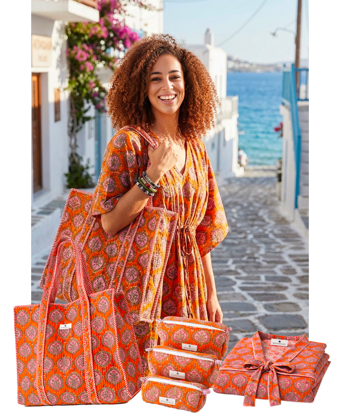 Kit Voyage Benares – Cabas, caftan et trousses block print
