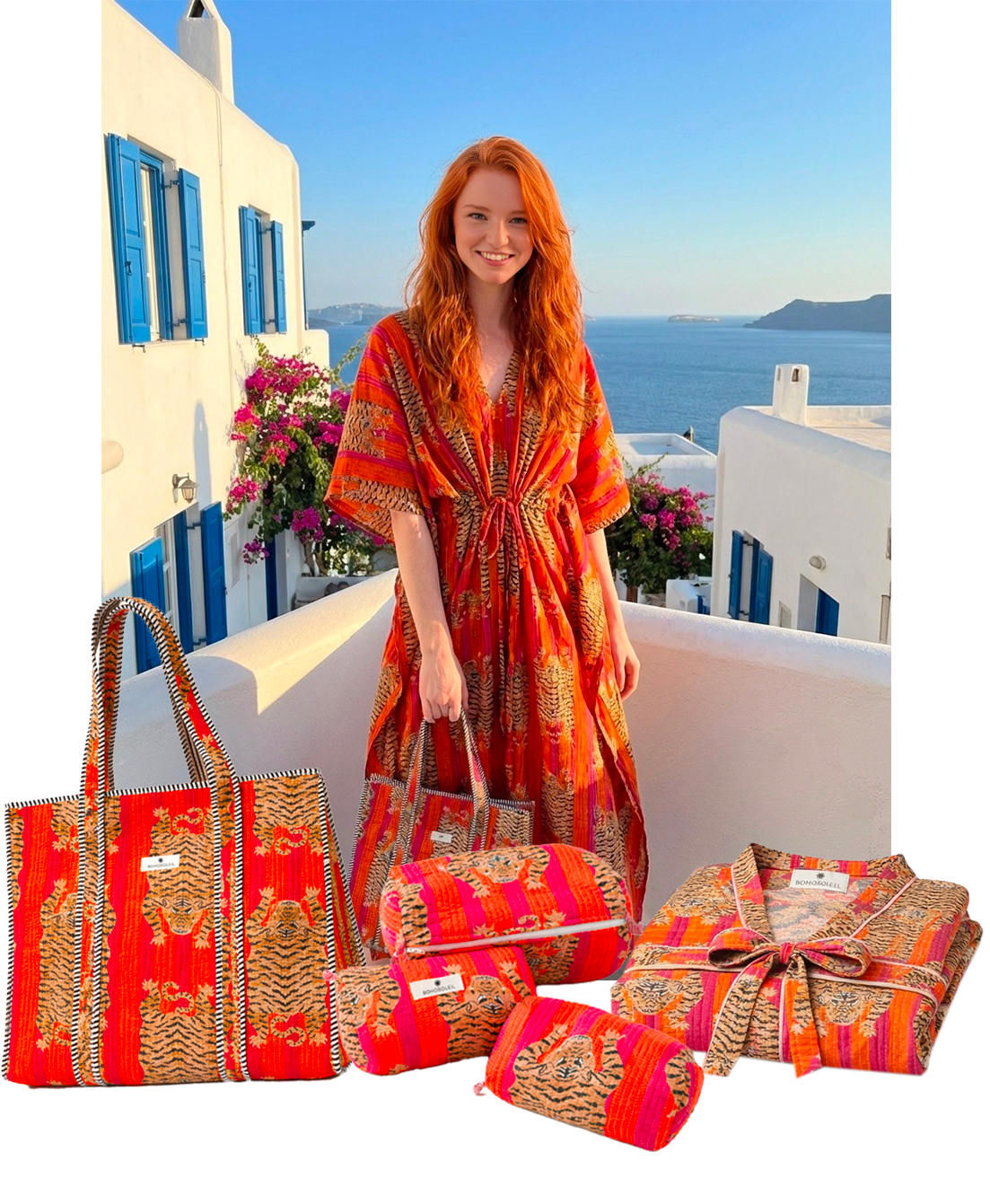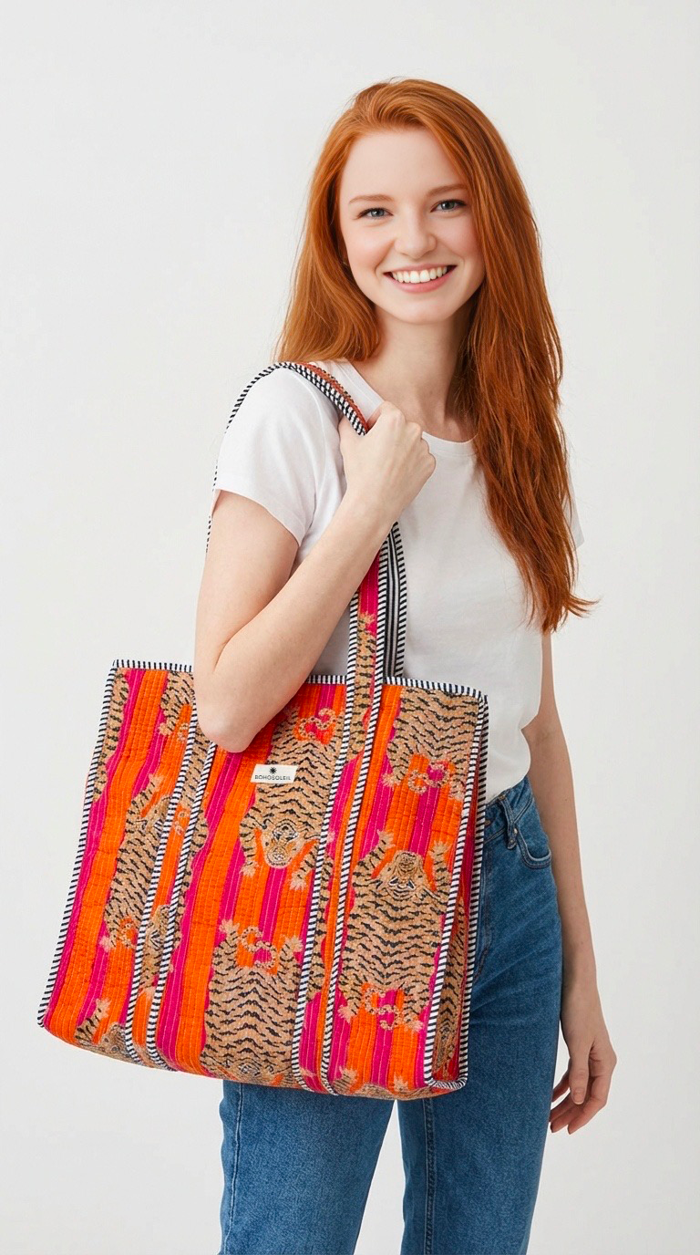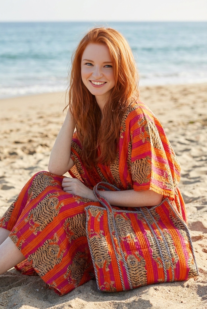 Le kit Voyage de Bohosoleil réunit trois pièces emblématiques du savoir-faire indien : un caftan fluide, un trio de trousses matelassées et un cabas spacieux, tous confectionnés en block print artisanal. Chaque motif est imprimé à la main avec des tampons en bois sculptés, offrant à chaque pièce une identité unique, faite de subtiles variations, signatures du véritable travail fait main.