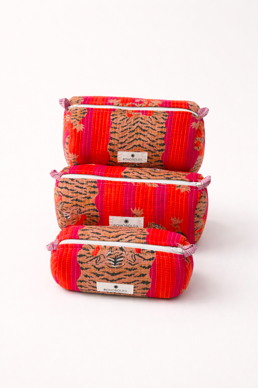 Réalisées en coton matelassé block print et doublées de nylon imperméable, les trois trousses s’organisent naturellement :