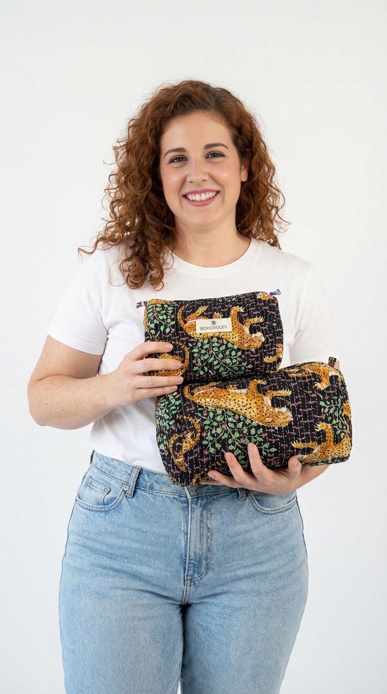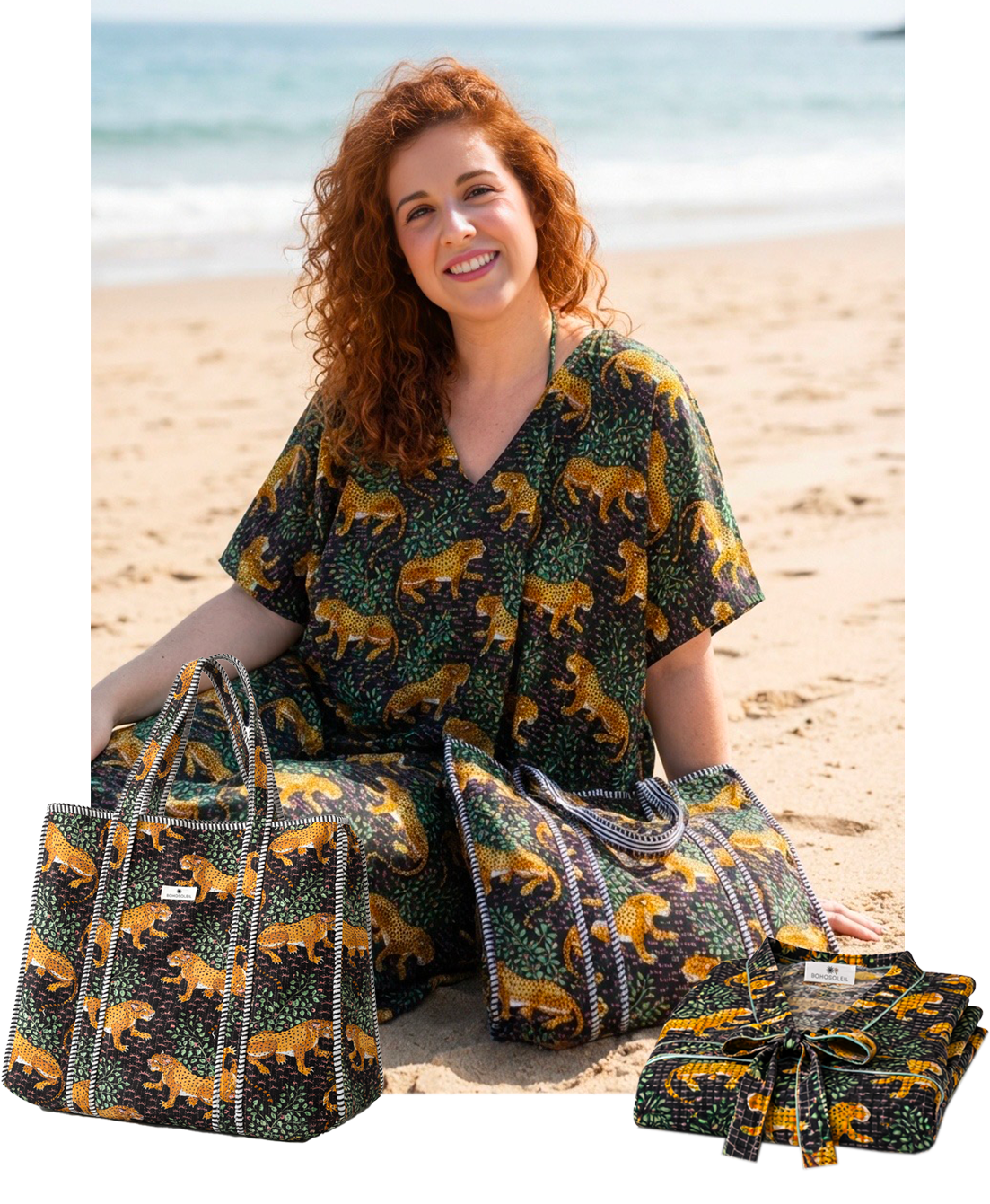 Le kit Voyage de Bohosoleil réunit trois pièces emblématiques du savoir-faire indien : un caftan fluide, un trio de trousses matelassées et un cabas spacieux, tous confectionnés en block print artisanal. Chaque motif est imprimé à la main avec des tampons en bois sculptés, offrant à chaque pièce une identité unique, faite de subtiles variations, signatures du véritable travail fait main.