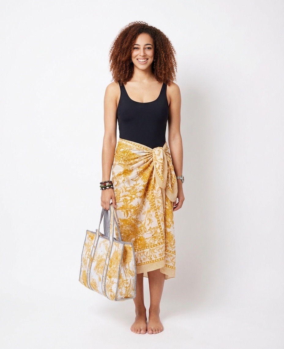 Confectionné à la main à partir de coton naturel, le paréo Nairobi en tissu block print incarne la légèreté et l’élégance estivale. Son tissu est imprimé selon la technique ancestrale indienne du block print où chaque motif est appliqué manuellement à l’aide de tampons en bois sculptés.