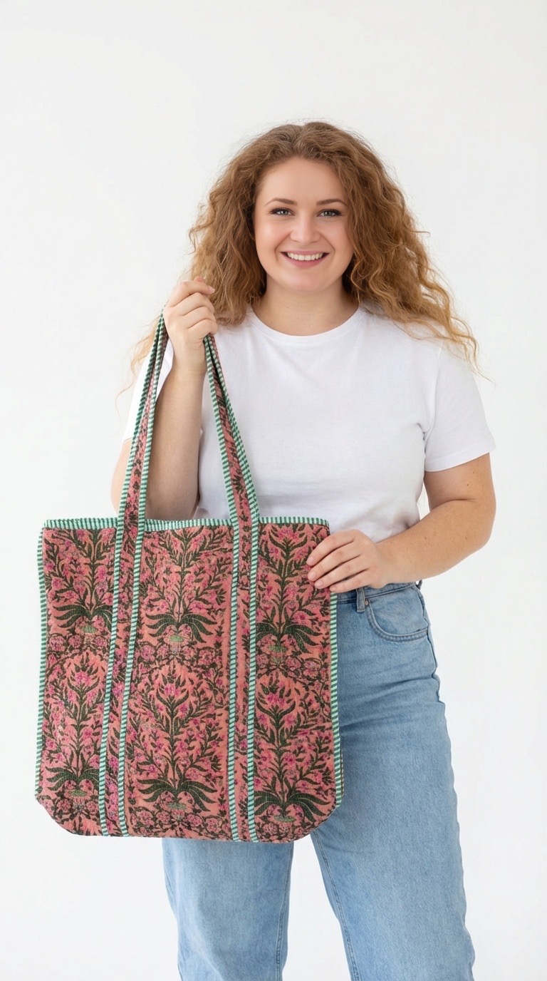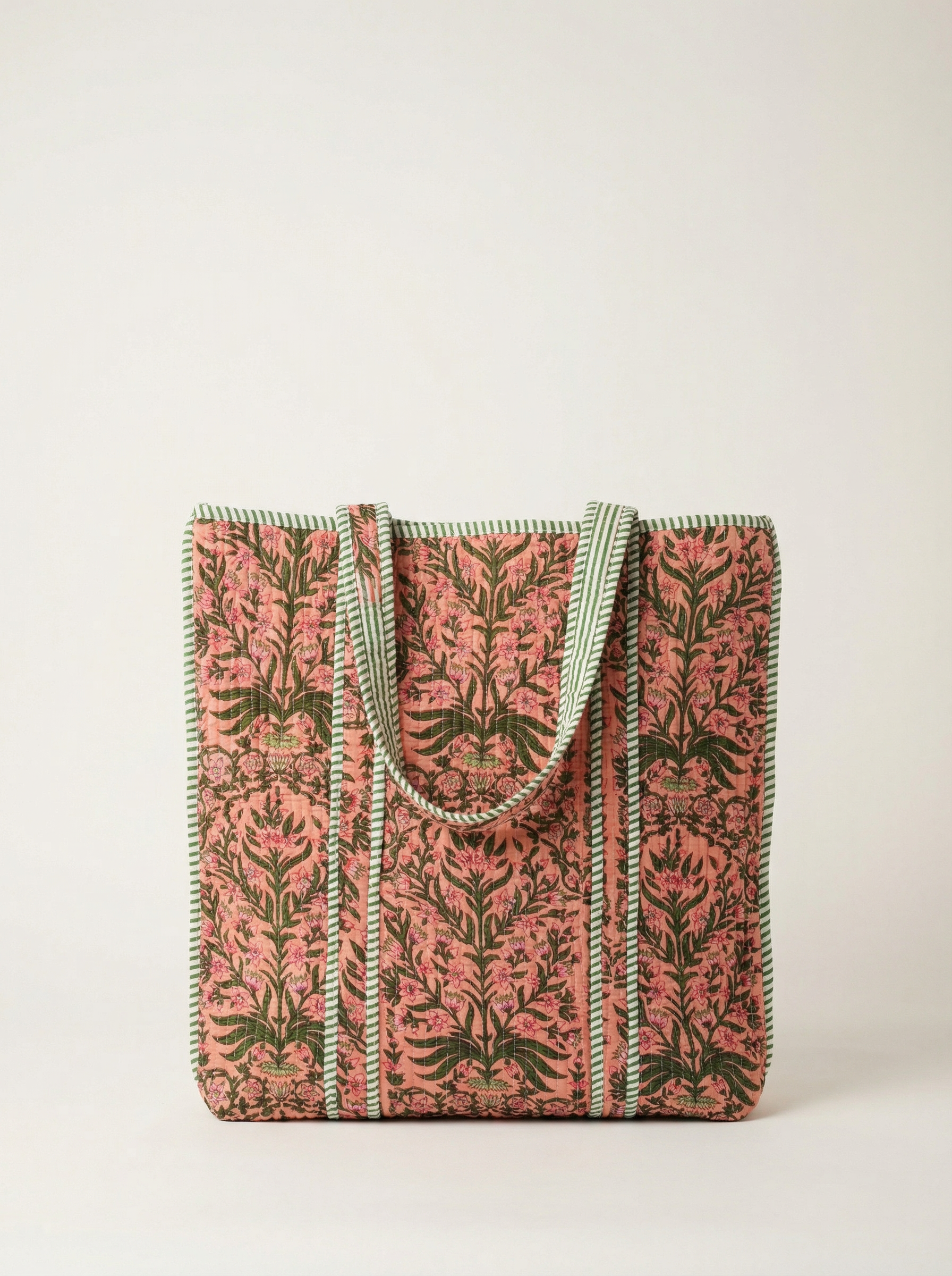 Le block print indien est un savoir-faire transmis de génération en génération. L’impression manuelle révèle de légères variations dans le motif, signature du travail artisanal et gage d’un produit unique. Le coton matelassé apporte structure, douceur et résistance, tout en renforçant l’allure haut de gamme du cabas.