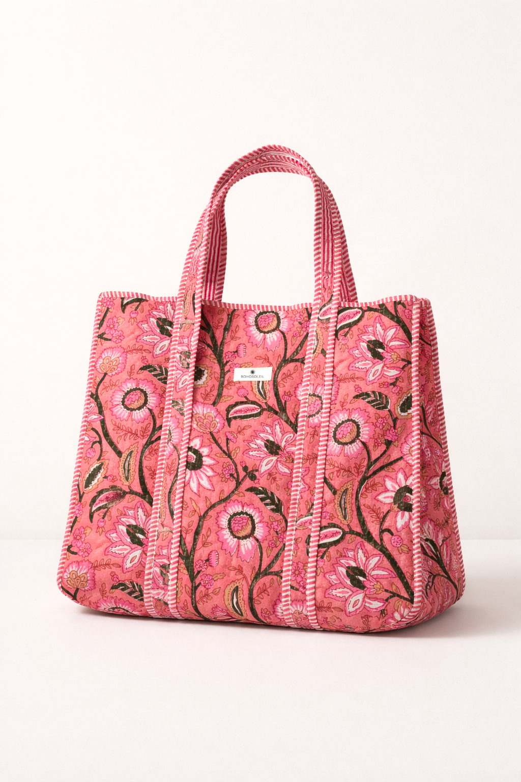Le block print indien est un savoir-faire transmis de génération en génération. L’impression manuelle révèle de légères variations dans le motif, signature du travail artisanal et gage d’un produit unique. Le coton matelassé apporte structure, douceur et résistance, tout en renforçant l’allure haut de gamme du cabas.