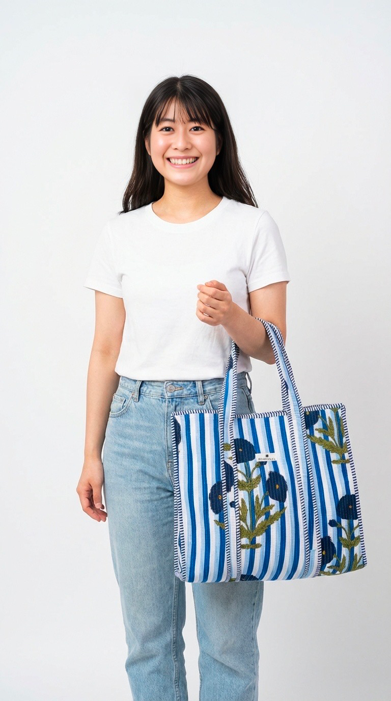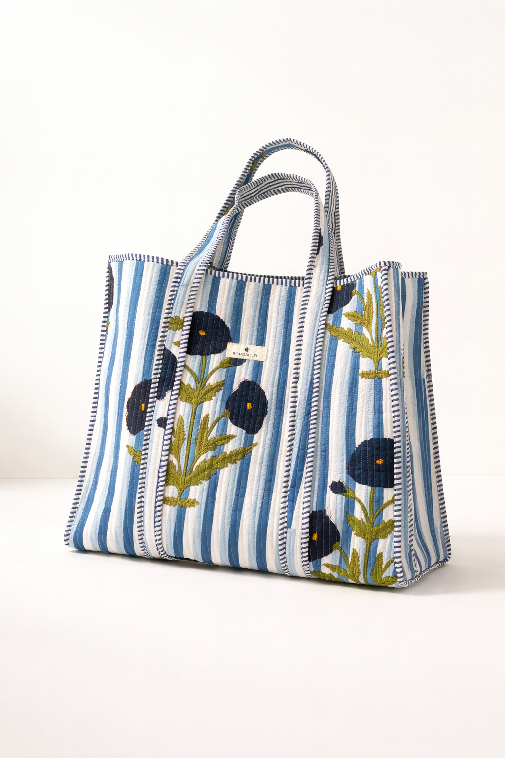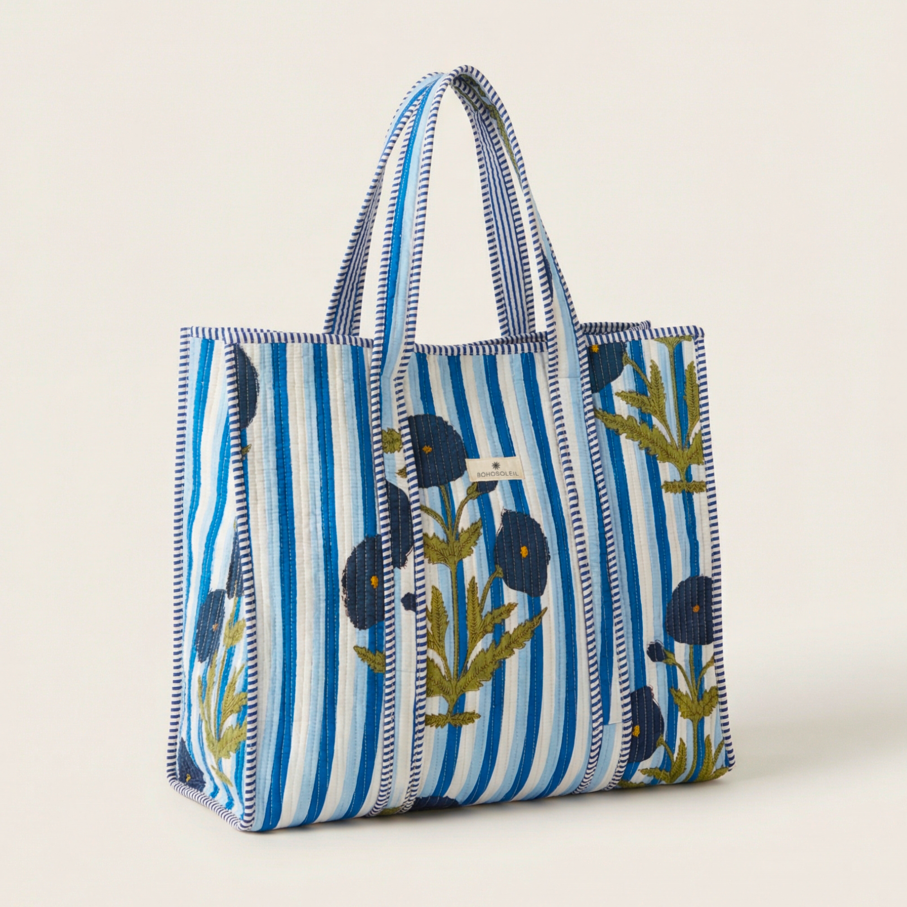 Le block print indien est un savoir-faire transmis de génération en génération. L’impression manuelle révèle de légères variations dans le motif, signature du travail artisanal et gage d’un produit unique. Le coton matelassé apporte structure, douceur et résistance, tout en renforçant l’allure haut de gamme du cabas.