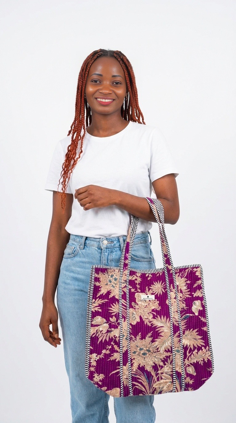 Le block print indien est un savoir-faire transmis de génération en génération. L’impression manuelle révèle de légères variations dans le motif, signature du travail artisanal et gage d’un produit unique. Le coton matelassé apporte structure, douceur et résistance, tout en renforçant l’allure haut de gamme du cabas.