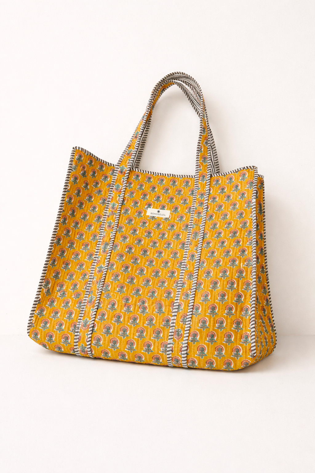 Le block print indien est un savoir-faire transmis de génération en génération. L’impression manuelle révèle de légères variations dans le motif, signature du travail artisanal et gage d’un produit unique. Le coton matelassé apporte structure, douceur et résistance, tout en renforçant l’allure haut de gamme du cabas.