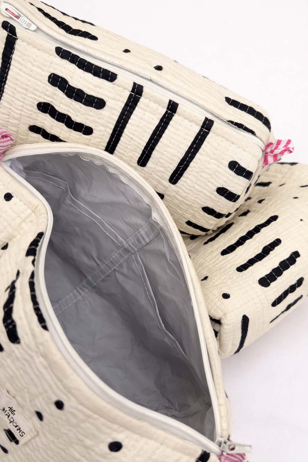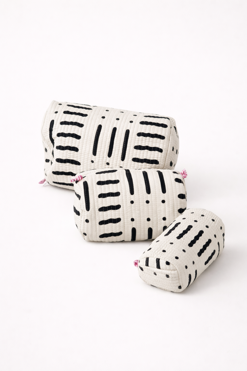 Confectionnées à la main à partir de tissu block print indien, les trois trousses partagent un même univers graphique, décliné harmonieusement sur chaque pièce.