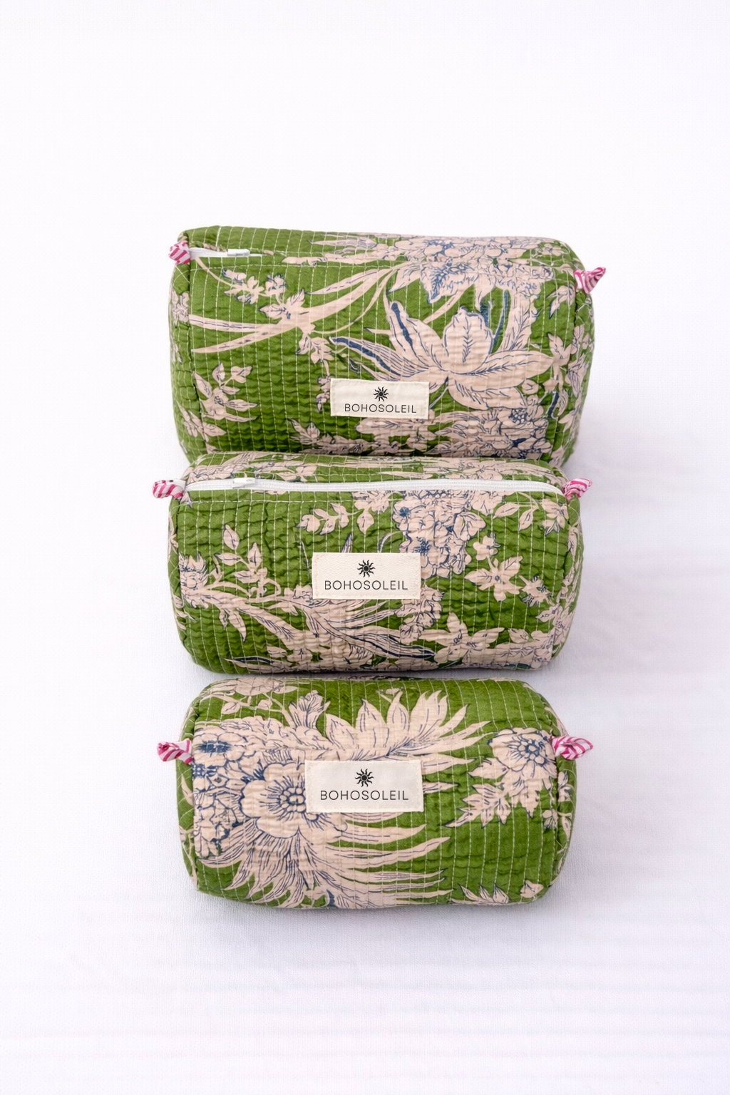 Confectionnées à la main à partir de tissu block print indien, les trois trousses partagent un même univers graphique, décliné harmonieusement sur chaque pièce.