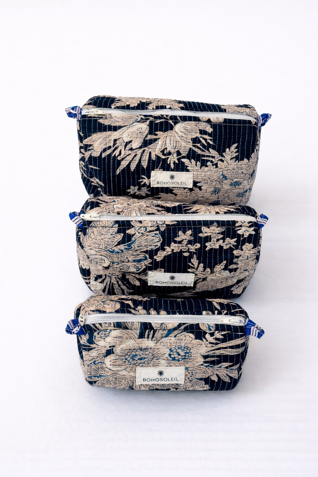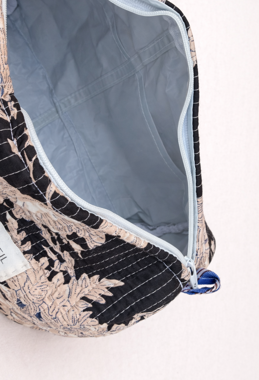 Confectionnées à la main à partir de tissu block print indien, les trois trousses partagent un même univers graphique, décliné harmonieusement sur chaque pièce.