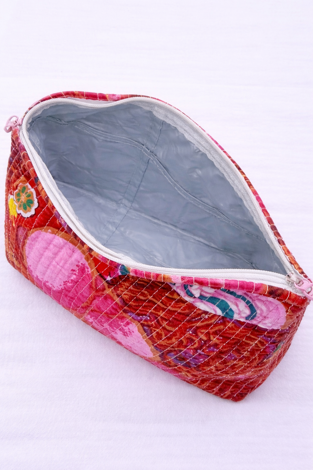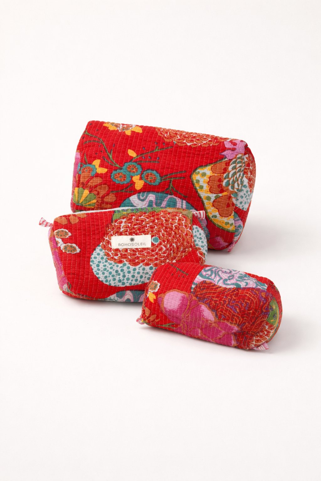 Confectionnées à la main à partir de tissu block print indien, les trois trousses partagent un même univers graphique, décliné harmonieusement sur chaque pièce.