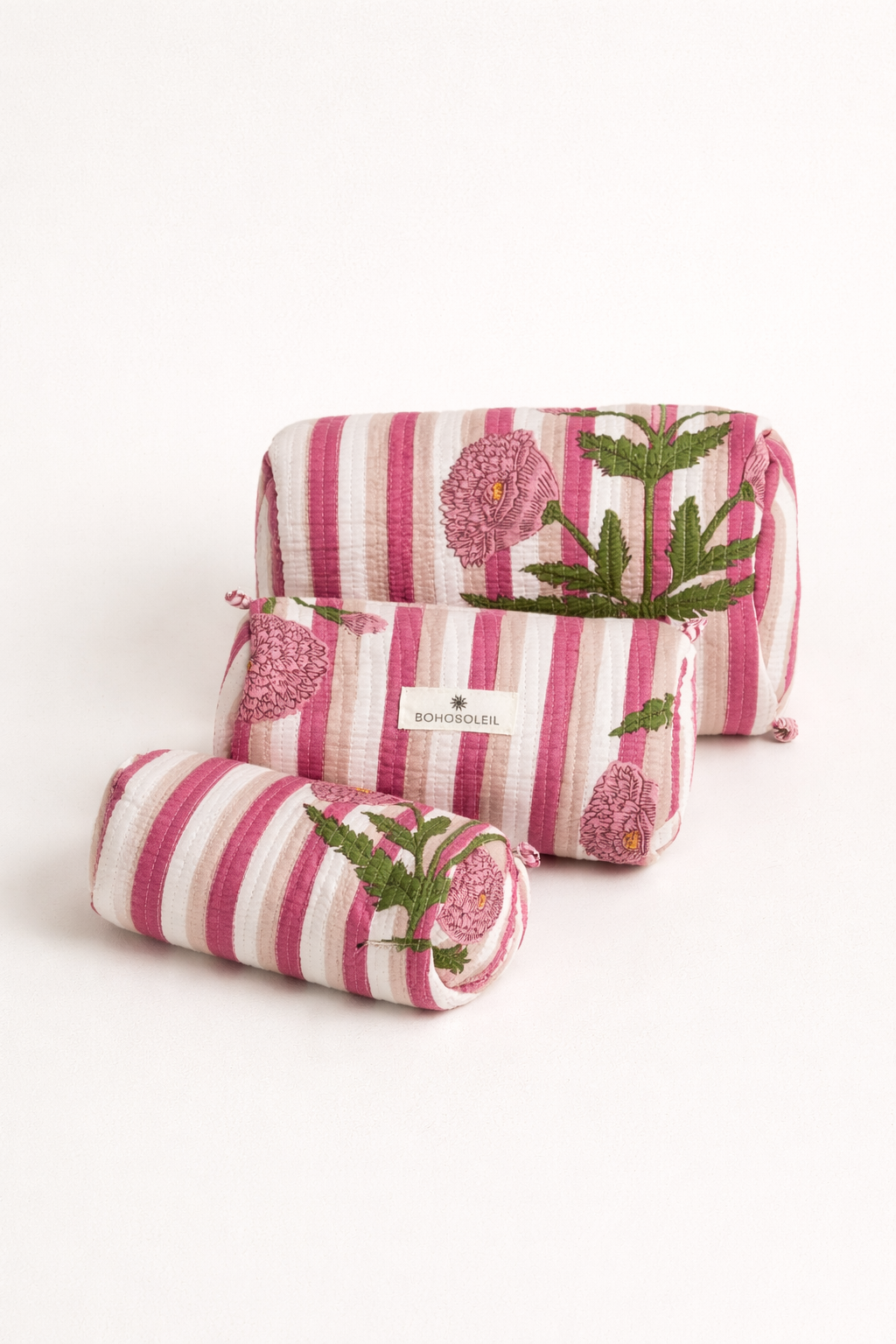 Confectionnées à la main à partir de tissu block print indien, les trois trousses partagent un même univers graphique, décliné harmonieusement sur chaque pièce.