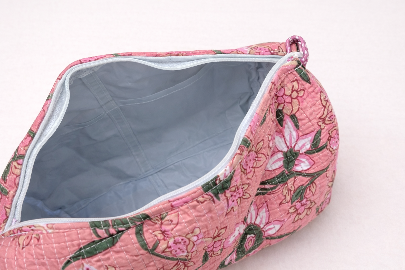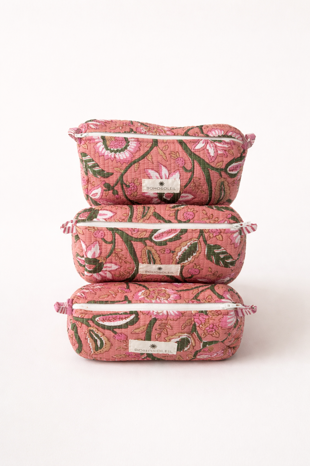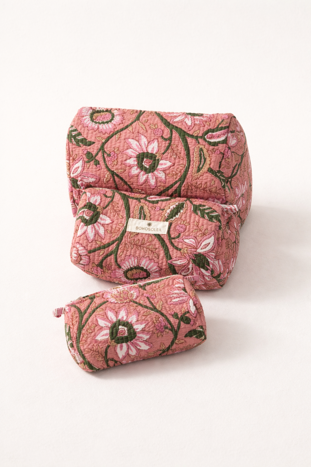 Confectionnées à la main à partir de tissu block print indien, les trois trousses partagent un même univers graphique, décliné harmonieusement sur chaque pièce.
