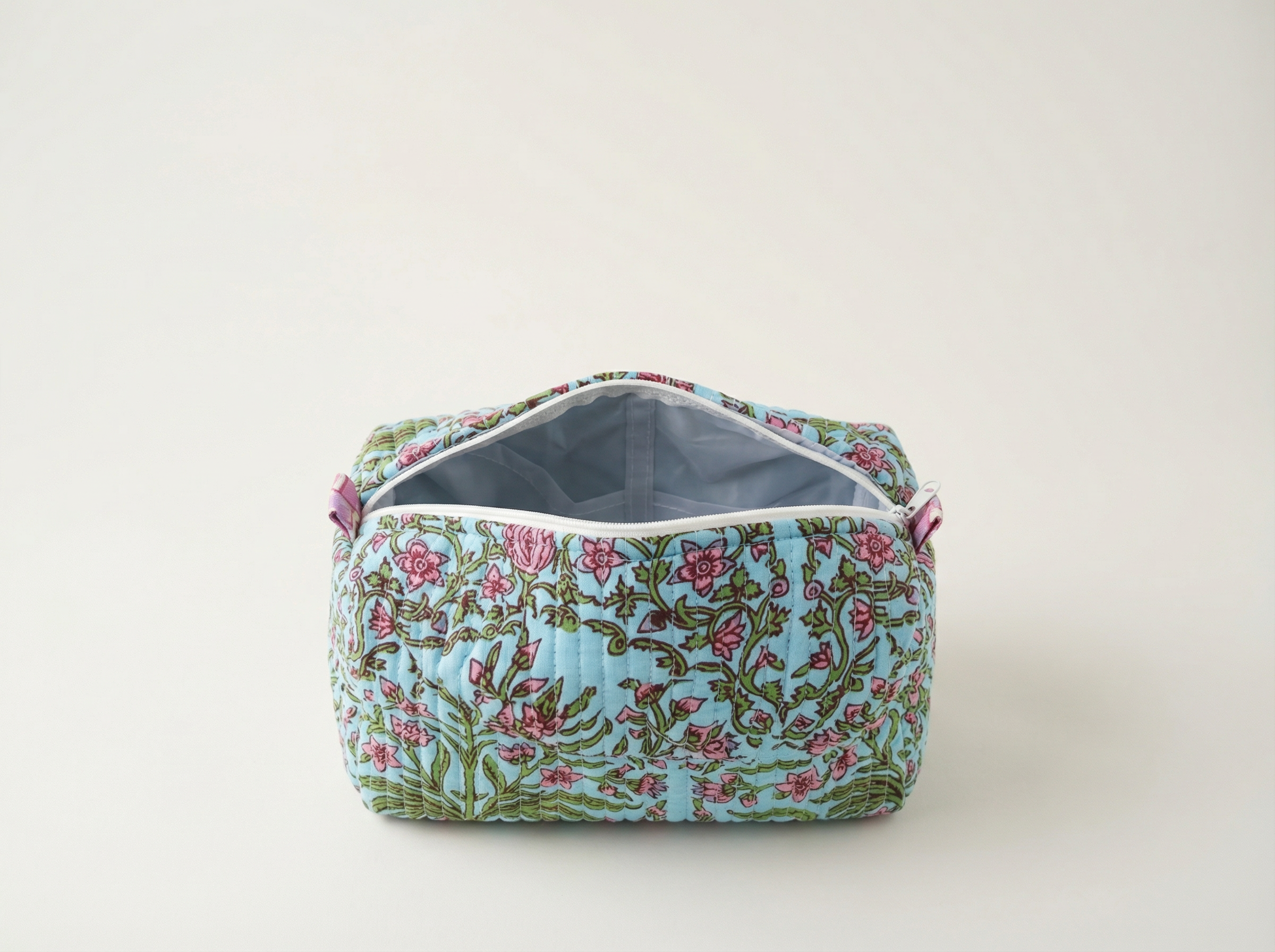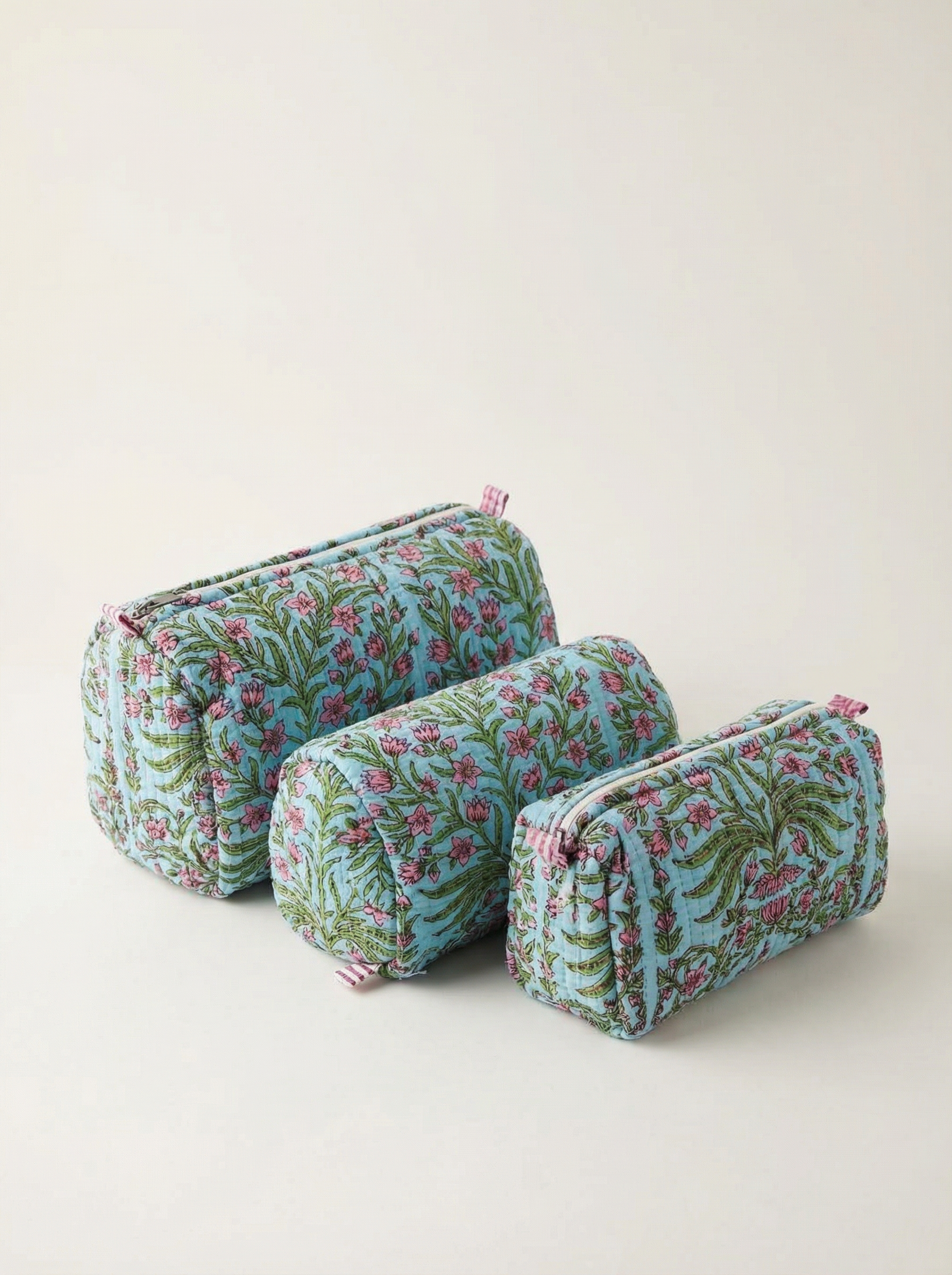 Confectionnées à la main à partir de tissu block print indien, les trois trousses partagent un même univers graphique, décliné harmonieusement sur chaque pièce.