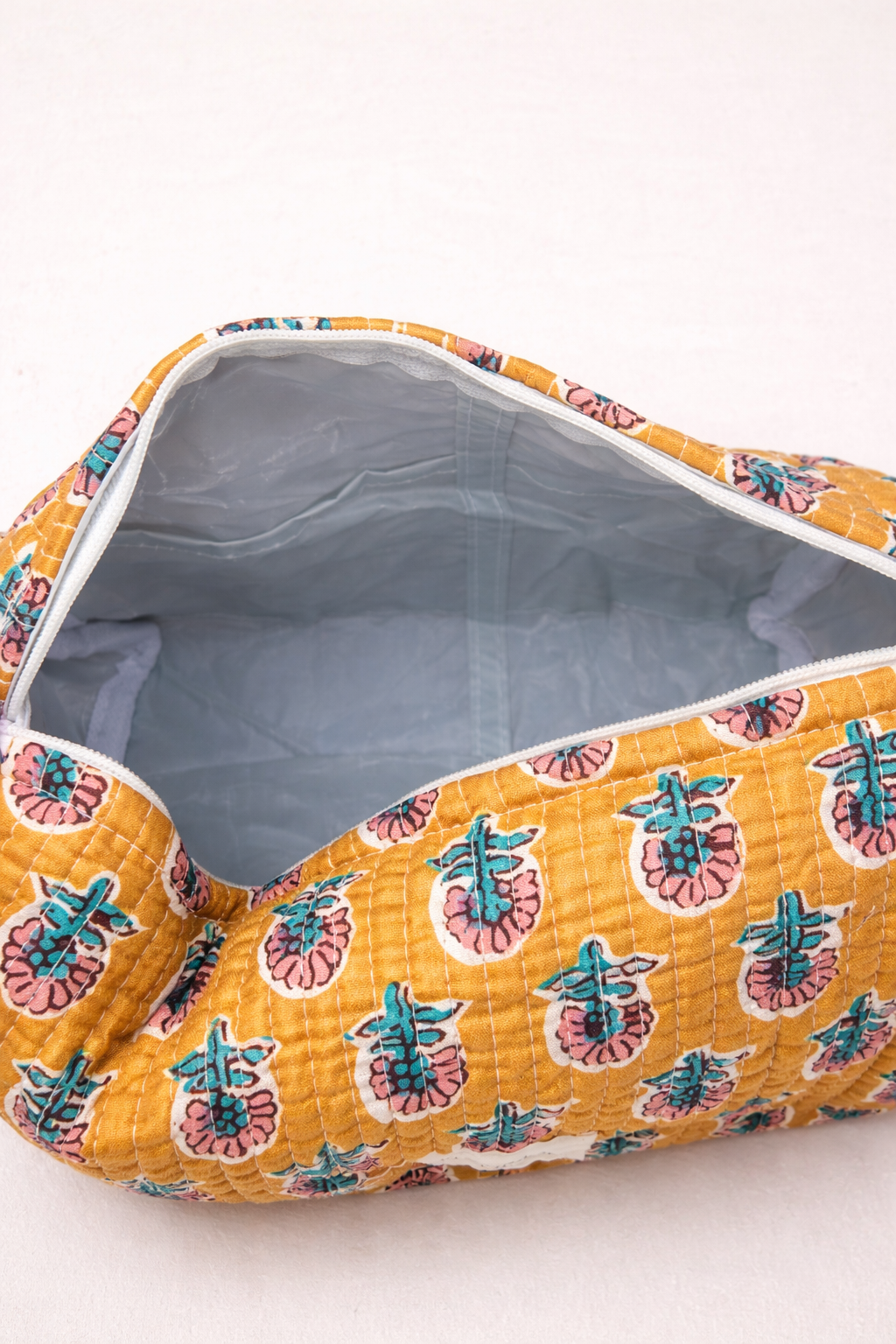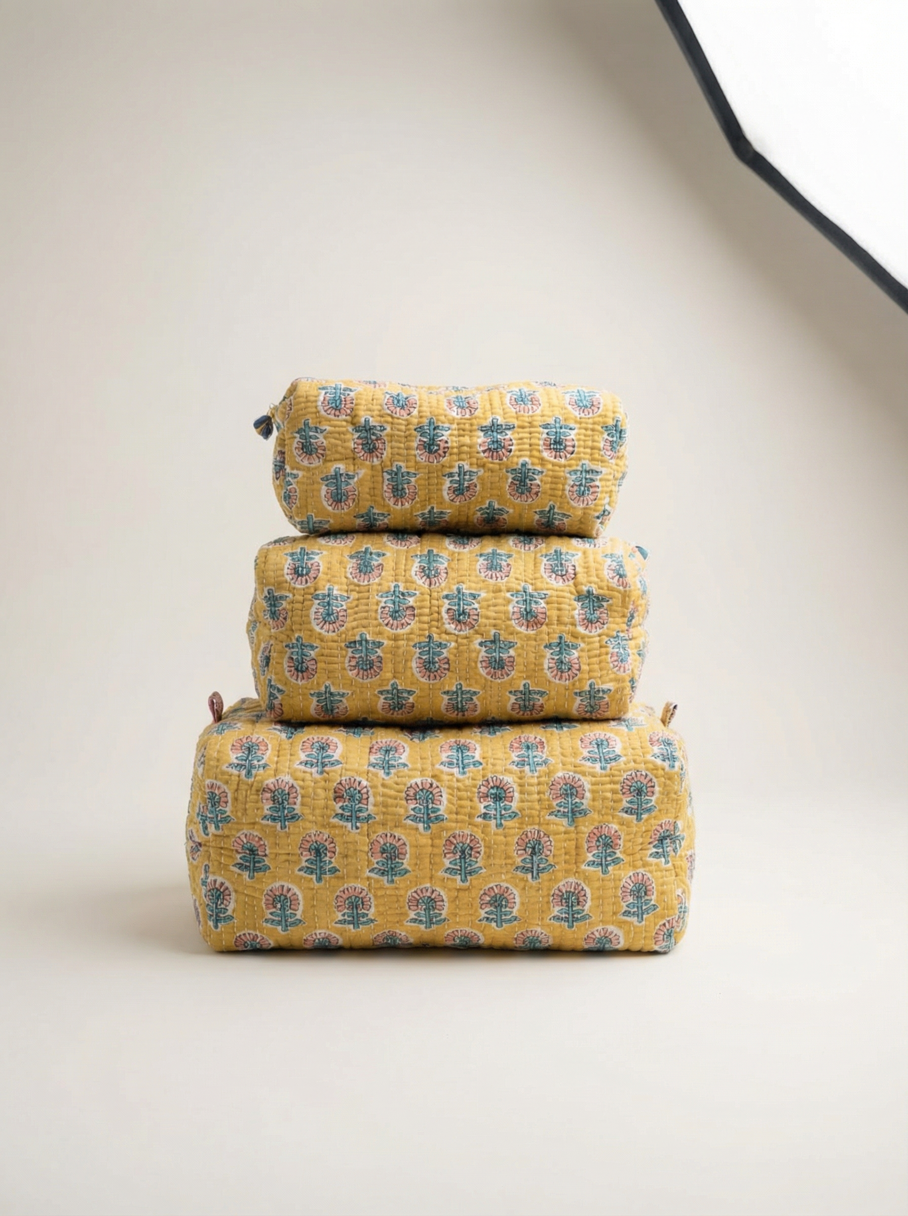 Confectionnées à la main à partir de tissu block print indien, les trois trousses partagent un même univers graphique, décliné harmonieusement sur chaque pièce.