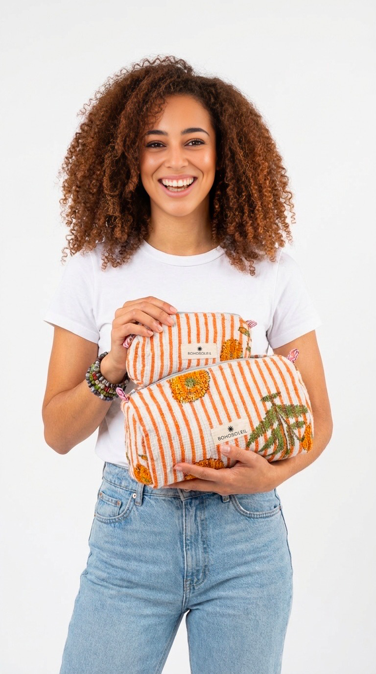 Confectionnées à la main à partir de tissu block print indien, les trois trousses partagent un même univers graphique, décliné harmonieusement sur chaque pièce.